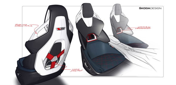 Сиденья ŠKODA VISION RS, визуально парящие в воздухе, выполнены из искусственной замши Alcantara. В отделке их верхней части использованы углеродные волокна, переработанные из полиэстера. В честь 100-летия со дня основания Чехословакии дизайнеры использовали в оформлении сидений цвета чешского флага и разместили его изображение на боковинах. Еще один пример экологичного подхода к созданию автомобилей — это коврики из материала Piñatex, который повторяет структуру плетения углеродных волокон, однако выполнен из листьев ананаса.